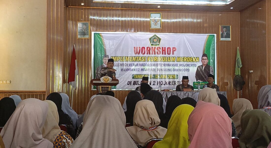 Acara workshop ini dibuka secara resmi oleh Bapak Muttakin, M.Ag, selaku Kepala Kementerian Agama Kabupaten Mojokerto. Dalam sambutannya, beliau menyampaikan apresiasi atas semangat para guru madrasah dalam mengikuti pelatihan-pelatihan penguatan implementasi Kurikulum Merdeka, serta menekankan pentingnya kolaborasi dan inovasi dalam menghadirkan pembelajaran yang bermutu dan relevan dengan perkembangan zaman.